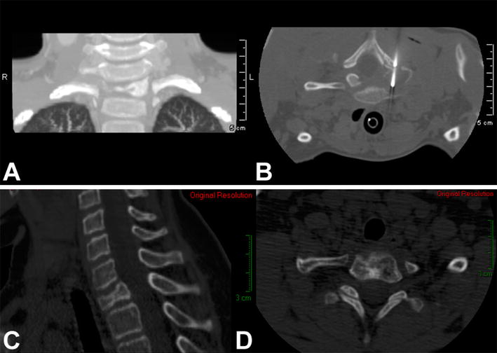 a Coronal CT scan of the cervical spine of a 5-year-old boy with a painful osteolytic lesion of the C7 vertebral body. b CT-guided frozen section biopsy showed eosinophilic granuloma; intralesional methylprednisolone injection was performed. c, d Sagittal (c)and axial (d) CT scans showing complete reconstitution of the lesion 5 years after diagnosis and treatment