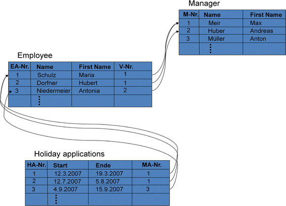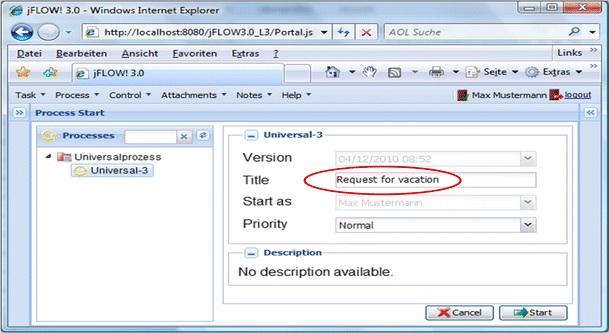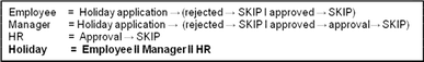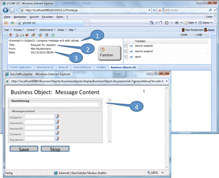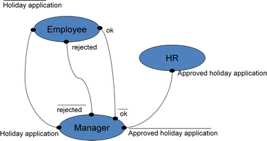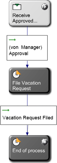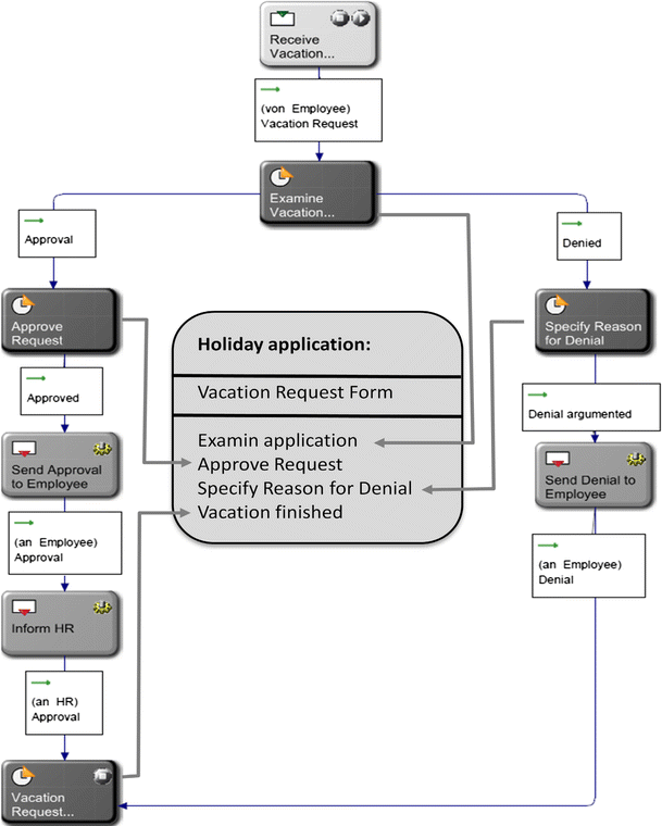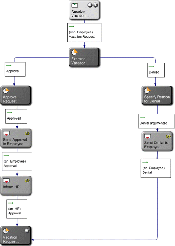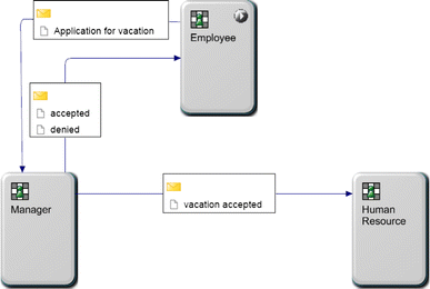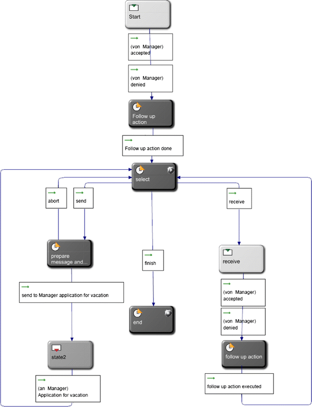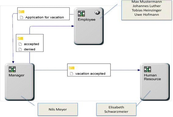 The persons Max Mustermann, Tobias Heinzinger, Uwe Hofmann und Johannes Luther are assigned to subject ‘employee’. Since these persons are assigned to the start subject, all of them can start the process. For instance, Max Mustermann creates the message Application for vacation and sends it to Nils Meyer. Nils Meyer, who is assigned to the subject manager, can accept that message and can send a message Accepted or Denied back to subject employee—the message is received by Max Mustermann because he is assigned to the subject employee. Max Mustermann receives the message because in his environment or context, the process is started. If another person assigned to subject employee starts a process, this process instance is executed in his or her environment.