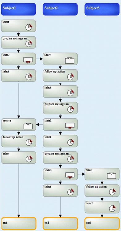 With each restriction step, the guidance for the subject holders is becoming more stringent to task accomplishment. In this way, a subject-oriented system specification can guide the parties in a process. It can be used to produce an execution protocol recording the sequences messages have been exchanged between the involved parties. Another advantage is that a workflow can be generated automatically (see Sect. 3.4). The only parameter that must be known is the number of involved parties besides the subject starting the process execution.