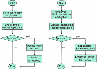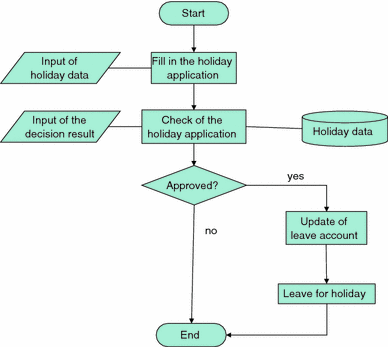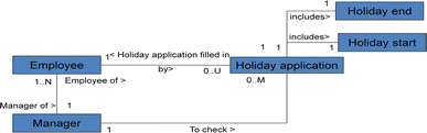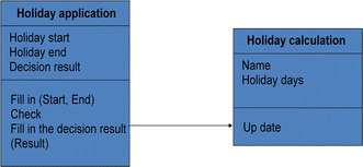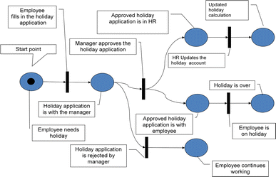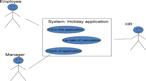The Holiday Application class allows formulating incomplete sentences, such as ‘fill in holiday application form’ or ‘check holiday application for holidays’. In order to create complete sentences, some original object-oriented methods provide the capability to insert names for subjects in natural language terms. Today, Use Case diagrams, as provided by UML, enable the specification of subjects. For instance, UML provides 13 different categories of diagrams, one of them being the Use Case diagram (see below).