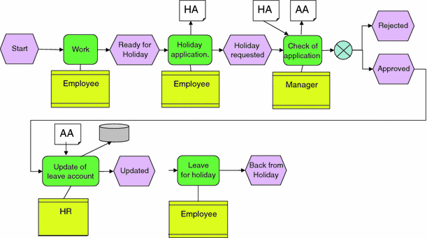 The interplay between roles or employees and activities is specified through business process models, both on the level of individual work tasks, and on the organizational level. Applications are assigned to automated tasks or interactive chains of executions. In business process models acting roles, e.g., the employees are distinguished from predicates defining the activities of acting roles, and objects denoting the purpose of these activities. In the course of accomplishing their tasks, they receive work inputs and pass on results. Hence, interaction and communication, either direct or indirect, are to be considered as an essential activity of acting roles for subject-oriented modelling and specification.
