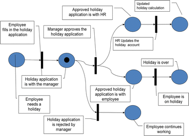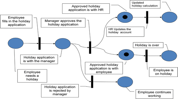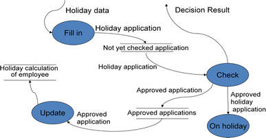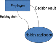 - Context diagram. Fig. 30 shows the context diagram when processing a holiday application. External interfaces are identified, and the system under development is represented as a function. The context diagram shows that the application data are received from an external interface, and the result of processing is delivered to that interface. In this example, the external interface can be considered as a subject. However, the manager has not been modelled explicitly, since being inherent to this system. In case the manager’s part and the update of the holiday sheet would be moved to external systems, an empty model would remain, since all activities occur externally.Fig. 30