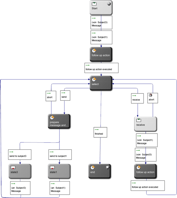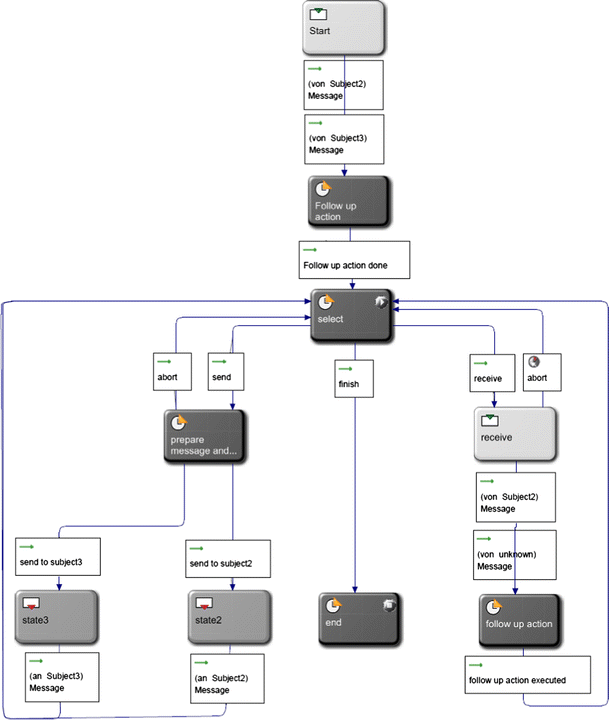 Each subject can send messages with the name Message to any other subject any time. Figure 3 shows the behaviour of the subject with the name Subject1. Since Subject1 is the subject that starts a process its start state is the state select. The start state is marked with a thick frame. The state ‘start’ and the transitions to the state select will be never executed in the start subject. This state is the start state in all the other subjects. All the other subjects are waiting for a message from all the other subjects.