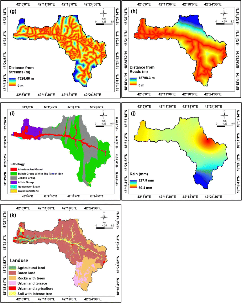 Landslide conditioning factors maps used in this study: a slope aspect map, b altitude map, c plan curvature map, d profile curvature map, e slope angle map, f distance from faults map, g distance from streams map, h distance from roads map, i lithology map, j rainfall map, and k land use map