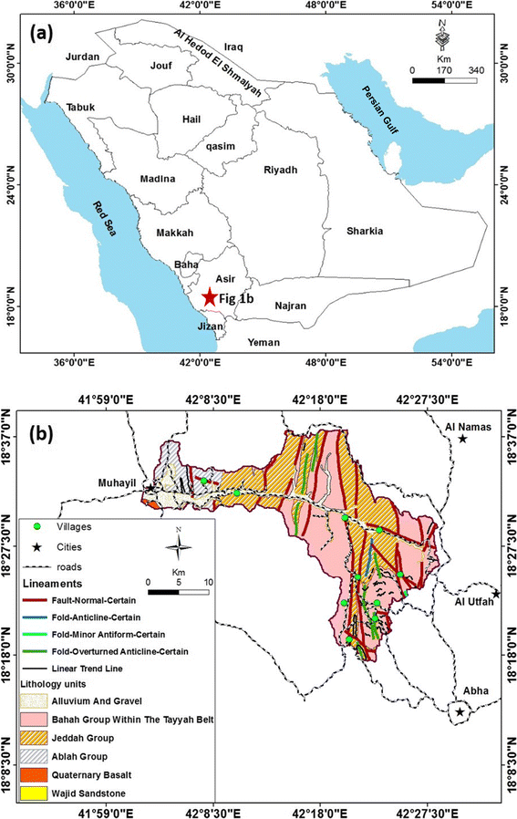 a Location of the study area in Saudi Arabia map. b Geology and structural map of the study area (note: urban areas and roads that are distributed in and around the study area overly the geology map)