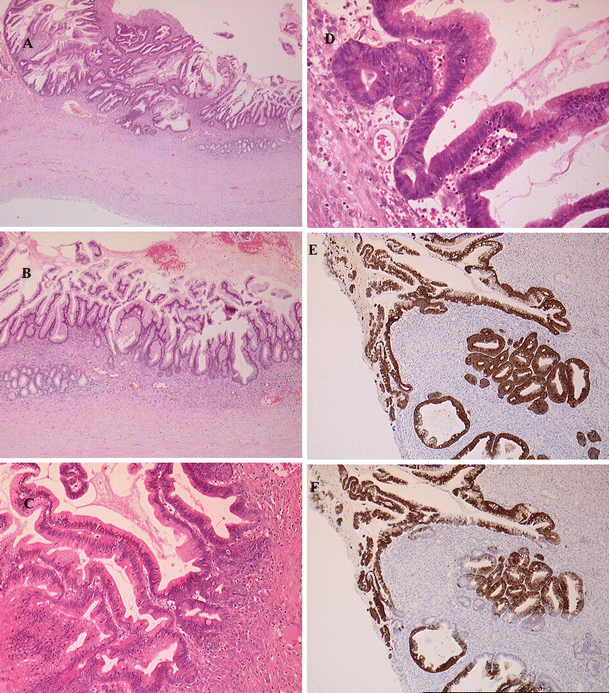 Microscopy: cyst lining comprising intestinal-type columnar mucous-secreting epithelium. The tumour displays a complex glandular architecture without stromal invasion (a–d). Stratification of the epithelium with a thickness of two to three cell layers (c, d). High-power view showing mild to moderate nuclear atypia with mitoses (d). Immunohistochemistry: the tumour exhibits diffuse strong expression of CK 7 (e) and patchy strong expression of CK 20 (f)