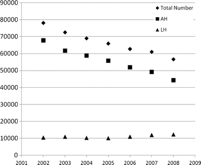 A total of 465,798 women in the HCUP-NIS database underwent hysterectomy for benign diseases between 2002 and 2008. This includes 389,189 (83.6 %) women who underwent AH and 76,609 (16.4 %) who underwent LH.