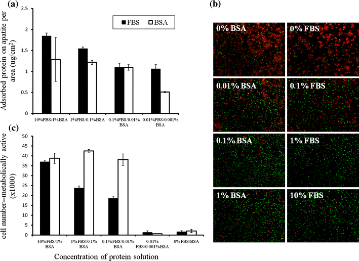 To assess the effect of adsorbed proteins on viability, either FBS or BSA was absorbed to the apatite-coated surfaces. Since FBS contains a variety of proteins including albumin, BSA was also chosen in this study to eliminate possible confounding effects that multiple protein adsorption from FBS may have on influencing cell behavior or function.