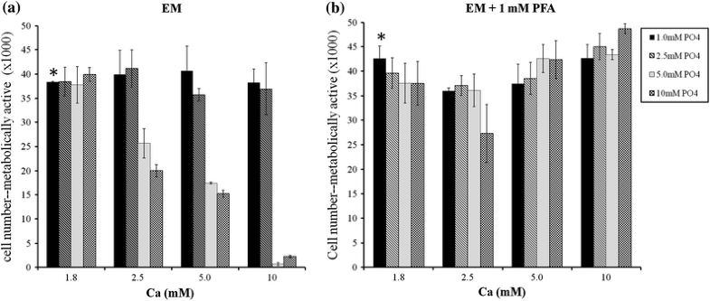 Extracellular Ca2+ and phosphate can affect MC3T3-E1 cell viability. (a) MC3T3-E1 cells were cultured on TCPS for 24 h in EM supplemented with extracellular Ca2+ (total range: 1.8–10 mM) and phosphate ions (total range: 1.0–10.0 mM). Unsupplemented EM containing basal Ca2+ and phosphate levels of 1.8 and 1.0 mM, respectively, is shown with an asterisk. The number of viable cells (cell number − metabolically active (×1000)) was quantified using an Alamar Blue assay and expressed with respect to calcium and phosphate levels. In the presence of increased phosphate, increasing the amount of supplemented Ca2+ leads to an increase in cell death. (b) MC3T3-E1 cells were prepared as in (a), but in the presence of the Na–Pi co-transport inhibitor PFA. Alamar Blue viability assay demonstrated that extracellular calcium and phosphate ion-induced cell death could be inhibited with PFA