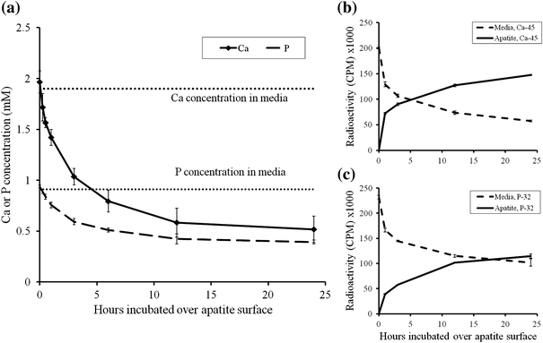 Apatite surfaces induce the “pull-down” of calcium and phosphate from the culture media. (a) Acellular apatite surfaces were incubated in serum-free α-MEM for up to 24 h. At the indicated times (hours incubated over apatite), the media was removed and subject to ICP-OES analysis to measure the concentrations of Ca and P ions within the media (Ca or P concentration (mM)). ICP-OES shows a progressive removal of Ca and P ions from the culture media within the first 6 h, suggesting that these ions are “pulled” out of the media and deposit onto the apatite surface. Levels for Ca and P in alpha-MEM reported by the manufacturer were measured by ICP-OES prior to incubation on apatite surfaces and are shown (dotted lines). (b, c) To confirm the ICP-OES results, serum-free α-MEM was supplemented with radioactive Ca-45 (b) or P-32 (c) and incubated on acellular apatite surfaces for various lengths of time up to 24 h (hours incubated over apatite). The media was then removed, followed by solubilization of the apatite in HCl. Radioactivity, in counts per minute (CPM) was measured in both media and apatite sample (radioactivity (CPM) × 1000). A time-dependent decrease in radioactivity within the media was observed (dashed lines), confirming the “pull-down” effect of Ca and P ions from the media onto the apatite surface. Solubilized apatite coatings showed increases in radioactivity (solid lines) that correlated almost exactly to the decrease in radioactivity in the media