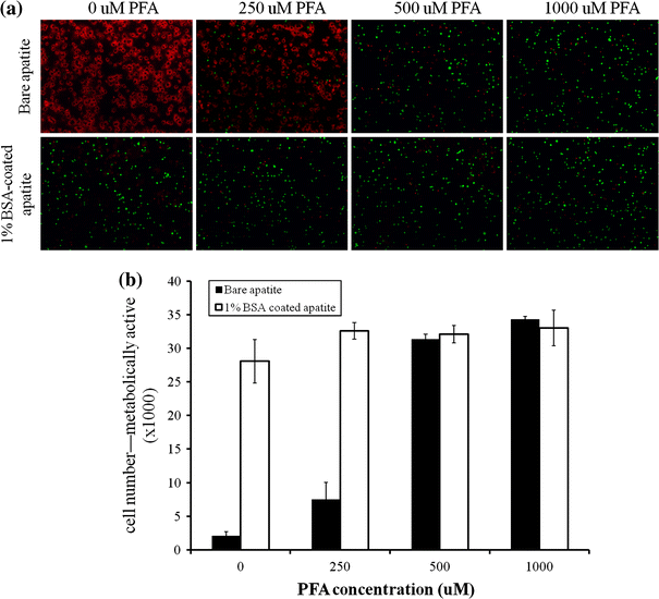 Blocking the uptake of phosphate ions can rescue the viability of MC3T3-E1 cells cultured on bare apatite. MC3T3-E1 cells were cultured for 24 h on bare apatite in EM supplemented with the Na–Pi co-transport inhibitor phosphonoformate (PFA) at the indicated concentrations to block entry of phosphate into the cells. Viable cells (green fluorescence) and dead cells (red fluorescence) were detected using a Live/Dead viability cytotoxicity stain. MC3T3-E1 cells were also cultured with PFA on apatite surfaces coated with 1% BSA (1% BSA-coated apatite) as a control for the effects of this inhibitor. Increasing levels of viable cells on bare apatite treated with increasing levels of PFA suggests that blocking phosphate uptake can “rescue” MC3T3-E1 cells from apatite-induced cell death. (b) MC3T3-E1 cells were cultured on either bare apatite (black bars) or 1% BSA-coated apatite (white bars) as a control, and the number of viable cells was determined via Alamar Blue assay (cell number − metabolically active (×1000)). Increasing amounts of PFA appears to increase MC3T3-E1 viability on bare apatite with a concentration of 500 μM rescuing the majority of cells