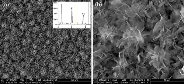 Plate-like morphology of biomimetically prepared apatite surfaces. Apatite surfaces were created in tissue culture polystyrene (TCPS) wells using an accelerated biomimetic approach. ×1000 (a) and ×5000 (b) scanning electron micrographs confirm the plate-like morphology of the resulting apatite surface. EDS analysis (a, inset) confirmed the content of calcium and phosphorus with a stoichiometric Ca/P ratio of 1.48