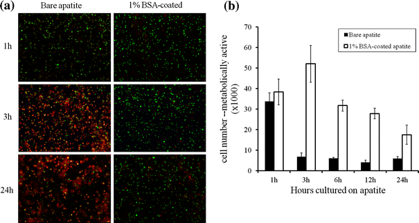 Bare apatite surfaces do not support cell viability. (a) MC3T3-E1 cells were seeded on uncoated apatite surfaces (i.e., bare apatite) and viability assessed after 1, 3, and 24 h using a Live/Dead stain. The majority of cells remain viable (green fluorescence) after 1 h. However, increased cell death (red fluorescence) is observed between 3 and 24 h. MC3T3-E1 cells cultured on 1% BSA-coated apatite surfaces retained viability at all time points assessed. (b) MC3T3-E1 viability was quantified over 24 h culture on bare apatite at the indicated times using an Alamar Blue fluorometric assay. The total number of metabolically active (i.e., viable) cells on the apatite surface was determined (cell number − metabolically active (×1000)) and expressed with respect to time (hours cultured on apatite)