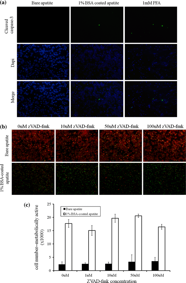 MC3T3-E1 cell death on bare apatite surfaces is not mediated through a caspase-dependent apoptotic pathway. (a) MC3T3-E1 cells were cultured on bare apatite (left panel), 1% BSA-coated apatite (center panel), or bare apatite with 1 mM PFA (right panel) for 1 h and then analyzed for immunofluorescent staining of activated caspase-3 (cleaved caspase 3—green fluorescence). Cell nuclei were counterstained with DAPI (blue) and the images merged. (b) MC3T3-E1 cells cultured on bare apatite (black bars) or 1% BSA-coated apatite surfaces (white bars) for 24 h in the presence of the general caspase inhibitor zVAD-fmk. Cell viability was assessed with Live (green)/Dead (red) staining. (c) Quantification of cell viability on bare apatite vs. 1% BSA-coated apatite in the presence of zVAD-fmk was assessed using fluorescent Alamar Blue assay. The number of viable cells (cell number − metabolically active (×1000)) was expressed with respect to the μM concentration of zVAD-fmk