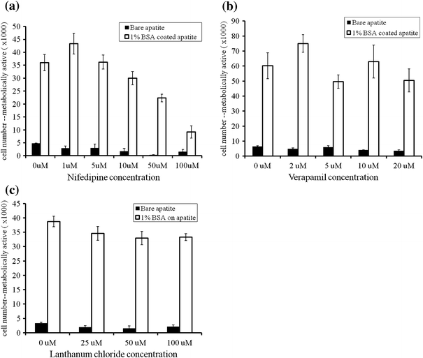 Blocking the uptake of calcium ions has no effect on the viability of MC3T3-E1 cells cultured on bare apatite. MC3T3-E1 cells were cultured for 24 h on bare apatite in EM supplemented with the L-type calcium channel inhibitors (a) nifedipine, and (b) verapamil and the general calcium channel blocker (c) lanthanum chloride at the concentrations shown (black bars). MC3T3 cells were also cultured with these inhibitors on apatite surfaces coated with 1% BSA (1% BSA on apatite) as a control for the effects of this inhibitor (white bars). The number of viable cells (cell number − metabolically active (×1000)) was measured via Alamar Blue assay. At the given concentrations indicated below, treatment with calcium channel blockers was not able to “rescue” viability of MC3T3-E1 cells cultured on bare apatite surfaces. Treatment with higher concentrations of nifedipine (i.e., 10–100 μM) indicated a possible toxic effect of this calcium channel blocker to control cells cultured on 1% BSA-coated apatite, while lack of toxicity was observed for the given concentrations of verapamil and lanthanum chloride