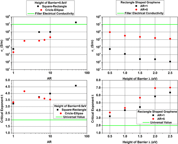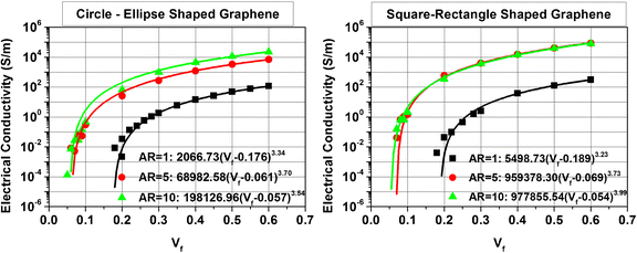 Finally, the effect of the graphene shape is calculated in respect of the volume fraction for the case of height of barrier being 0.5 eV [36]. The graphene shape does not affect the trend of the nanocomposite’s electrical response in function of the volume fraction (Vf). Although for graphene particles of the same aspect ratio and volume, the nanocomposite reinforced with rectangle shaped particles exhibits higher electrical conductivity than the one of the ellipse shaped, while the rectangle shaped graphene particles show comparable percolation threshold to that of the ellipse graphene. Yi et al. [37] suggested that this observation could be explained as the corner angles of squares and rectangles make it easier for the plates to touch each other, therefore enhancing the current passing from one particle to another.