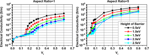 Effect of height of barrier on the electrical conductivity in respect of volume fraction Vf for rectangle shaped graphene and aspect ratios of 1 &5