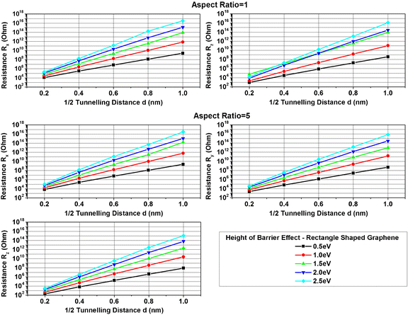 Finally, the effect of the shape of the graphene layer on the unit cell resistance is considered in respect of the direction and the tunnelling distance is depicted for all examined aspect ratios and height of barrier of 0.5 eV [36]. It could be stated that ellipse shaped graphene sheets exhibit higher local resistance in the main axis directions than the rectangle shaped ones. However, for the case of the through thickness resistance, for the common aspect ratios ellipse and rectangle shaped graphene plates show the same electrical resistance. It is important to mention that for the purposes of comparison, the area of the rectangle shaped graphene layers is equal to that of the elliptical shaped graphene layers for each aspect ratio.
