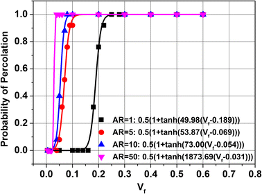 Percolation probability in respect of volume fraction for studied graphene aspect ratios for the case of λ = 0.5 eV and the corresponding functions