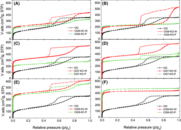 Regarding mesoporosity, large differences can be seen concerning both the mesopore volume (Table 2; Fig. 4) and the presence and position of the hysteresis loop in the N2 adsorption isotherms (Fig. 3). For the activation in K2CO3, the mesoporosity of the pristine xerogel is somewhat preserved at all temperatures, being the effect more pronounced for the samples obtained by wet impregnation (the dependence of the mesopore volume with the activation temperature followed a flat line). While the mesopore volume remains constant, the shape and position of the hysteresis loop changed significantly (Fig. 3). With the exception of sample OG7-KC-P, all the samples displayed prominent H2(a) hysteresis loops expanding over a wide range of relative pressures (from 0.45 to 0.9) and showing a steep decrease in the desorption branch at relative pressures close to 0.45. This is characteristic of pore systems formed by mesopores of different widths (wide openings), likely interconnected with narrow pore necks (Thommes et al. 2015). What is important to highlight is that the activation using K2CO3 enabled to preserve the mesoporosity of the pristine xerogel. When physical mixing is applied, the activation reaction is less efficient than wet impregnation, with lower surface areas and pore volumes (both micro- and mesopore) for the same temperature (Fig. 4).