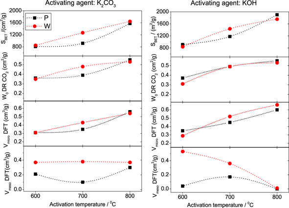 Overall, the yield and the mesoporosity of the carbons do not seem to be not directly related with the matrix consumption, but to the formation of metallic potassium. The large mesoporous structure is observed at low activating temperatures (i.e., 600 °C) when metallic potassium is not formed and hence the intercalation reaction within the carbon lattice does not take place. At higher temperatures, the contribution of the activation due to the intercalation of potassium becomes more important, and the obtained carbons present lower mesopore volumes (being the effect more pronounced in the case of KOH).