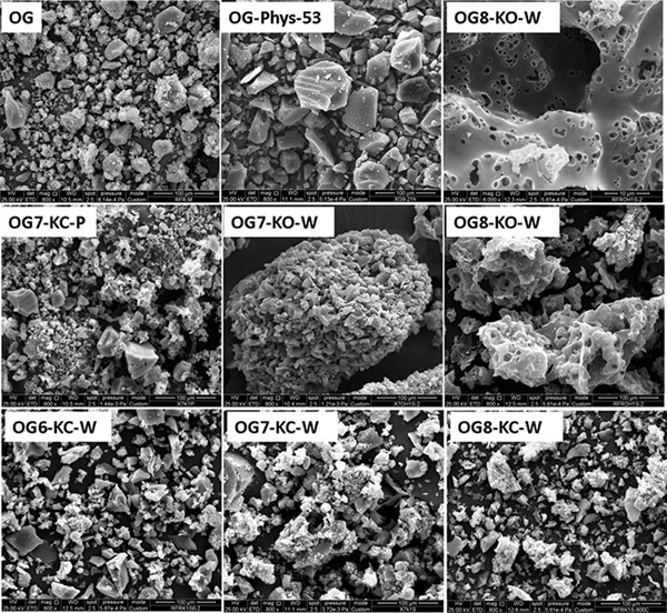 Figure 5 shows SEM images of the materials prepared by the different activation procedures (see other magnifications in Fig. S6). The chemical activation modified the morphology of the particles, leading to the formation of aggregates of varied sizes. This effect is more pronounced as the temperature of activation is increased, and for KOH than for K2CO3 -with little effect of the impregnation procedure-. In contrast, the physical activation (which was also carried out at a high activation temperature) barely modified the particle morphology of the carbon precursor.