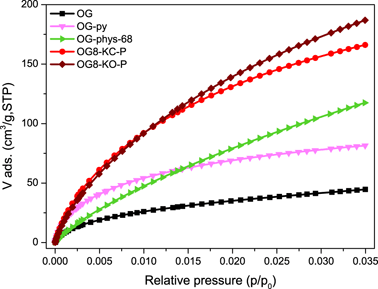 The analysis of the pore size distribution of the samples (Fig. 1b; Fig. S2) confirmed the shrinkage of the mesoporous structure upon carbonization and physical activation, with the average mesopore size decreasing from ca. 5–6 nm for OG to values of about 2–3 nm for OG-py and OG-phys-Q, respectively. In contrast, sample OG8-KC-P displayed a bimodal micro-mesopore system with a wide mesoporosity comprised of small and large mesopores (centered at about 7 nm). Thus, the chemical activation reaction with K2CO3 prevented the collapse of the porosity of the organic xerogel induced by the effect of the thermal treatment at high temperature, leading to the formation of new microporosity accompanied by the enlargement of the mesopore structure. On the other hand, sample OG8-KO-P displayed a distribution of pore sizes similar to that of the samples obtained by physical activation, with a large fraction of micropores and an almost negligible volume of mesopores (Fig. 1b). As for the narrow microporosity, the samples obtained by chemical activation presented higher volumes of CO2 adsorbed (Fig. 2) than those obtained by physical activation, indicating the existence of pores of smaller sizes. Interestingly, despite their differences in the N2 adsorption isotherms, samples OG8-KC-P and OG8-KO-P presented similar narrow micropore volumes (Table 2). Also, the less pronounced curvature of the CO2 adsorption isotherm of sample OG8-phys-68 at low relative pressures (compared to the samples prepared by chemical activation) indicates the occurrence of pores of larger dimensions (in average).