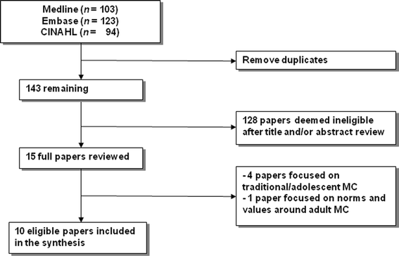 To develop the search strategy, we first split the research question into four components: (a) male or infant circumcision, (b) HIV prevention, (c) acceptability, and (d) qualitative research. Synonyms for the four components were identified through reading relevant literature. Additional synonyms were identified through a review of pilot search results. The search was first conducted using Medline Medical Subject Headings (MeSH) terms and text searches. Thereafter, two searches were conducted in Embase and CINAHL Plus using key terms and text words (plus thesaurus) relevant to each database. In addition to allowing for adjacency for words in a phrase, word endings were truncated to ensure inclusiveness of text searches. The Boolean operator “OR” was used to identify all papers related to each component after which search returns of all four components were combined using the operator “AND”. The final search in the three databases was run and closed on 22 January 2013. Identified papers from each of the databases were imported into an Endnote reference management software file (library). Duplicates were identified and removed.