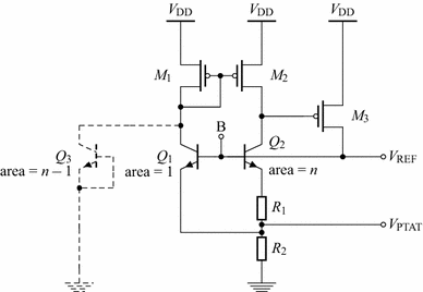 Because \(Q_1\) and \(Q_2\) differ in size and carry equal collector currents, they are biased at different current densities, and thus, a voltage \(\Delta V_\mathrm {BE}\) develops across their emitters, that is, over \(R_1\). Because \(\Delta V_\mathrm {BE}\) is PTAT, the current through \(R_1\), \(I_\mathrm {E2}\), will be PTAT. Assuming equal emitter currents, \(I_\mathrm {E1} = I_\mathrm {E2} = I_\mathrm {E}\), the current through \(R_2\) (\(2 I_\mathrm {E}\)) will also be PTAT, and therefore \(V_\text {PTAT}\) will be PTAT. The voltage \(V_\text {REF}\) will be the sum of \(V_\text {PTAT}\) and the base-emitter voltage of \(Q_1\), \(V_\mathrm {BE1}\). Thus, scaling the ratio of \(R_2 / R_1\) appropriately makes \(V_\text {REF}\) independent of temperature and equal to \(V_\mathrm {G0}\) because the first-order temperature-dependent terms are cancelled.