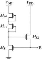 To avoid the operating point at which no current flows through \(Q_1\) and \(Q_2\), a start-up circuit must be introduced. This circuit is shown in Fig. 3 and is connected to the circuit of Fig. 2 through their common node B. It operates by having the pull-up network \(M_\mathrm {S3}\)–\(M_\mathrm {S4}\) turn \(M_\mathrm {S2}\) on unless there is a voltage \(V_\text {REF}\) at node B to turn \(M_\mathrm {S1}\) on, which then in turn drives \(M_\mathrm {S2}\) off. This arrangement enforces a non-zero voltage, \(V_\text {REF}\) at node B.