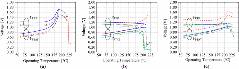 The obtained results were compared to the simulations of [7]. For Type RN circuits with an accuracy of \({3}^{\,\circ }\hbox {C}\) the median upper temperature limit is \({168}^{\,\circ }\hbox {C}\) for which \(V_\text {REF}\) varies by \({16}\, \hbox {mV}\). This result is in agreement with expected values based on simulation results from [7]. There, a Monte Carlo simulation showed a variation of \(V_\text {REF}\) of \(9.4\, \hbox {mV}\) over the 0 to \(175^{\,\circ }\hbox {C}\) temperature range, with a standard deviation of \(6.8\, \hbox {mV}\).