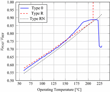 Figure 7 shows a \(V_\text {PTAT} / V_\text {REF}\) ratio for different types of compensation circuit based on data of selected curves from Fig. 6. The curves were not chosen to quantify performance, but rather to illustrate the characteristic behaviour of each of the different types of compensation circuit. The selected graphs are from sweeps from which the highest temperature ranges were obtained. For the Type 0 circuit, the curve is highly non-linear and experiences a rapid decrease at \(220^{\,\circ }\hbox {C}\), where both \(V_\text {REF}\) and \(V_\text {PTAT}\) are reduced rapidly. The Type R circuit achieves good linearity up to \(210^{\,\circ }\hbox {C}\), followed by a rapid increase in \(V_\text {PTAT} / V_\text {REF}\) where both \(V_\text {REF}\) and \(V_\text {PTAT}\) fall off sharply. The Type RN circuit, on the other hand, presents good linearity over the entire 60–\(230^{\,\circ }\hbox {C}\) temperature range.