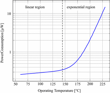 At \(60^{\,\circ }\hbox {C}\), the power consumption of the different chips ranged from 230 to \(320\,\hbox {nW}\) (mean \(260\,\hbox {nW}\)), which is a relative variation of 32%. At \(200^{\,\circ }\hbox {C}\), the power consumption ranged from 1.5 to \(2.8\,\upmu \hbox {W}\) (mean \(2.1\,\upmu \hbox {W}\)), reaching the higher relative variation of \(60\%\), and at \(230^{\,\circ }\hbox {C}\), the power consumption ranged from 9.5 to \(19\,\upmu \hbox {W}\) (mean \(14\upmu \hbox {W}\)), reaching a relative variation of 67%. This variation of power consumption between different regions of operation suggests that the power consumption generated by leakage current is more sensitive to process variation than is the power consumption generated by bias current.