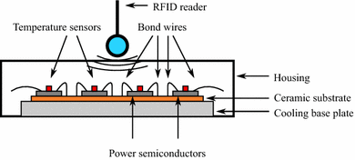 Schematic view of the cross-section of a wire-bond power semiconductor module whose devices are being monitored by single-chip temperature sensors powered by a nearby RFID reader [8]