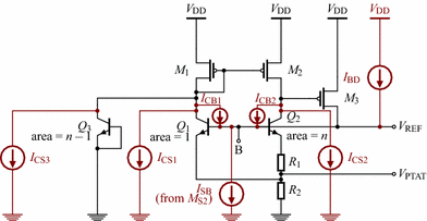 Leakage current poses a challenge in high-temperature IC design [15]. Figure 4 shows an extended version of the schematic in Fig. 2, where major sources of leakage current due to reverse-biased p-n junctions are shown and indicated as current sources. In this figure, CS leakage occurs in \(Q_1\), \(Q_2\) and \(Q_3\). Because leakage current in reverse-biased p-n junctions increases exponentially with increasing temperature [14], at high temperatures, the leakage currents of a low-power bandgap temperature sensor become significant as their magnitudes become comparable to that of the sensor’s quiescent current. One aspect of how leakage current adversely affects bandgap circuits has been studied by Radoiaş et al. [10, 11]. They found that, at high temperatures, CS leakage in the main bipolar pair causes the collector currents \(I_\mathrm {C1}\) and \(I_\mathrm {C2}\) to become mismatched due to differing sizes of the respective transistors.