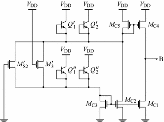 Start-up circuit for the Brokaw bandgap circuit of Fig. 2. This circuit is connected to the bandgap circuit through their common node B