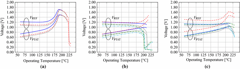 For Type 0 circuits (Fig. 6(a)) significant non-linearities are introduced in \(V_\text {REF}\) and \(V_\text {PTAT}\) at temperatures as low as \(150^{\,\circ }\hbox {C}\). For Type R and Type RN compensations, it can be seen from Fig. 6(b), (c) that the same magnitude of non-linearities do not occur until above \(175^{\,\circ }\hbox {C}\).