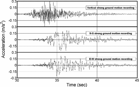 Vertical, N–S and E–W strong ground motion recordings at Mirandola station, 20 May 2012, 04:09 (UTC) \(\text{ M }_\mathrm{L}= 5.9\). (Source: Italian Civil Protection)