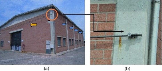 a Steel ties anchorage system installed after the main event to stabilize the structure: orange arrow showing the external tie, blue arrows showing the internal ties. b Detail of the anchorage at the external tie
