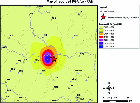 Map of recorded PGA of some stations of the RAN network and the RAIS network in the area close to the epicentre after the 20 May event, 04:09 (UTC) \(\text{ M }_\mathrm{L}= 5.9\) (Source: USGS)
