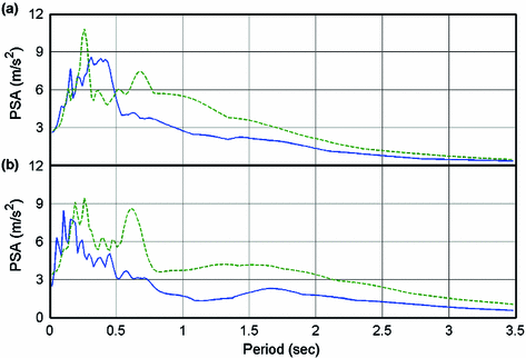 Response spectra at Mirandola station in the N–S (green dashed line) and E–W (blue line) directions, for the earthquakes of: a 20 May 2012, 04:09 (UTC) \(\text{ M }_\mathrm{L}= 5.9\). b 29 May 2012, 07:00 (UTC) \(\text{ M }_\mathrm{L}= 5.8\) (Source: Italian Civil Protection)