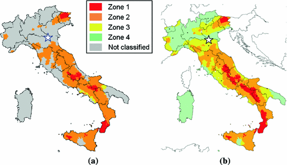 Italian seismic zoning map for design: a Before 2003. b After 2003