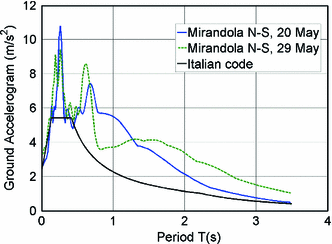 Spectra of the N–S component of the two strongest records compared to the Italian code spectrum