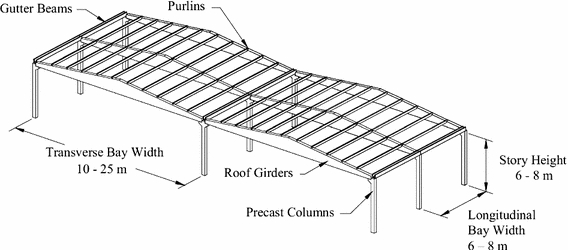 Typical configuration of a one-storey precast concrete industrial building (Wood 2006)