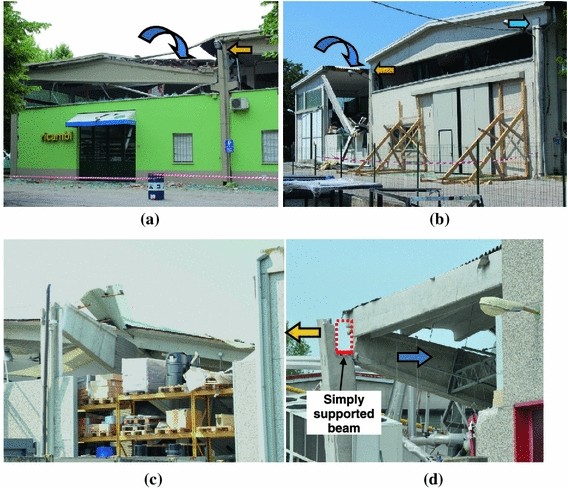 a Loss of beam seating from the central column and associated collapse of a double slope precast beam (the blue curved arrow shows direction of collapse and the orange arrow shows the intermediate beam); b longer seating of the end beam at the external column (blue arrow); c, d Displacement of the beam from the external column’s corbel following its collapse in the central column