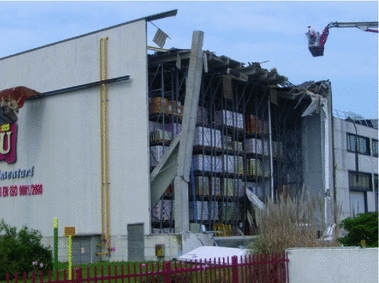 Partial collapse of the roof, longitudinal girders, column and front cladding of a flat roofed precast building