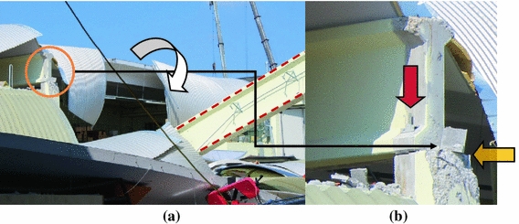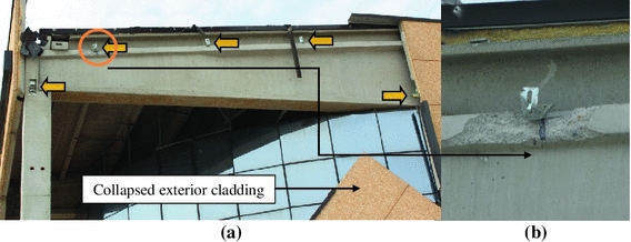 a Cladding panel collapse after failure of the connections with the main structure (orange arrows showing the location of connections of the collapsed exterior cladding); b detail showing failure of the mechanical connection