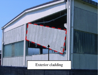 Most of the inspected buildings—designed with or without seismic provisions—presented failure of the connections of the cladding elements due to their insufficient displacement capacity that led to overturning of the cladding elements. The panel connections were designed to transfer the vertical (self weight) load of the panel, as well as any out-of-plane loading, to the main elements of the precast structure (beams and columns). For small drifts of the structure, the connections do not provide any in-plane stiffness interaction with the panels. However, during the earthquake the precast buildings might have been subjected to excessive interstorey drifts, as well as high out-of-plane inertial lateral forces, for which these connections were not designed for.