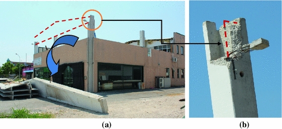 The rather limited distance of the dowels from the edge of the column and the limited amount of transverse reinforcement might have resulted into the formation of a shear crack across the concrete cover (Fig. 14b), followed by the loss of the dowels anchorage and consequently the loss of the girder seating. This failure reveals the absence of specific provisions for detailing the beam-to-column connections in the current Italian construction standards and the as well as in the Eurocodes (CEN 2004).