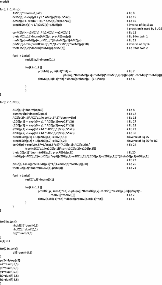 van den Berg SM, Beem L, Boomsma DI (2006) Fitting genetic models using Markov chain Monte Carlo algorithms with BUGS. Twin Res Human Genet 9:334–342